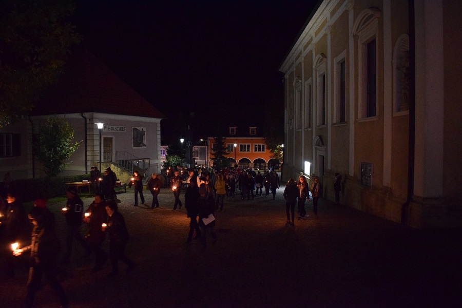 Am Friedhof angekommen gab es noch eine Station beim Kreuz. Die Kulisse war wie immer außergewöhnlich - der Friedhof mit Kerzen überseht und wir zwischendrin.