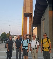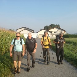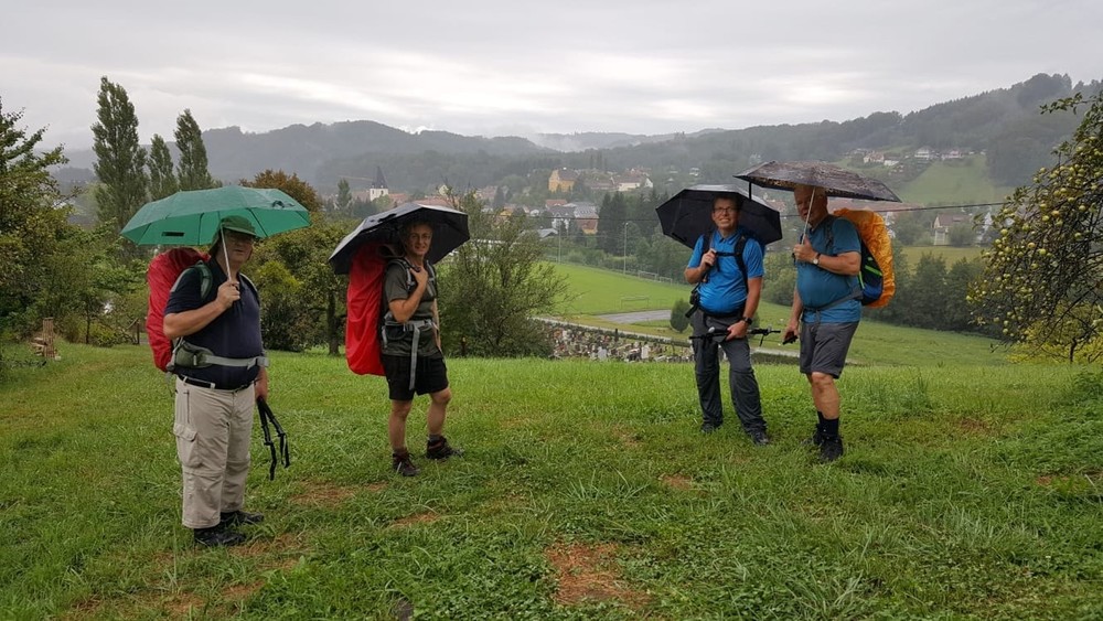 Am zweiten Tag führte uns der Weg - alle gut beschirmt (siehe Foto) - bei nassfeuchtem Wetter weiter nach Gamlitz. An der Ratscher Weinstraße überquerten wir die Staatsgrenze nach Sveti Kungota. Die Nächtigung erfolgte in Marburg.