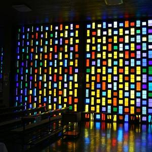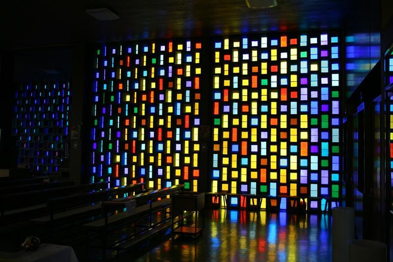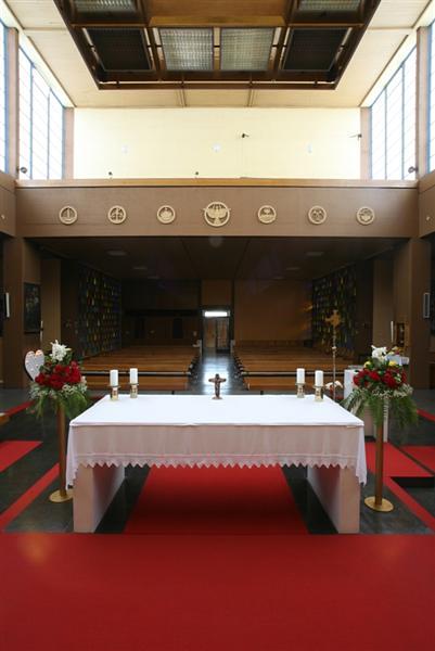 Die Kirche birgt im Zentrum des kreuzförmigen Grundrisses den Altarraum, um den in drei Blöcken die Sitzreichen angeordnet sind. Die tragenden Bauelemente sind aus schalungsrauem Sichtbeton gefertigt, die Farbglasscheiben der Wände wurden von Mario Decleva in kräftigen Farben gestaltet.